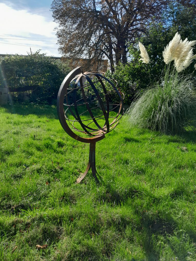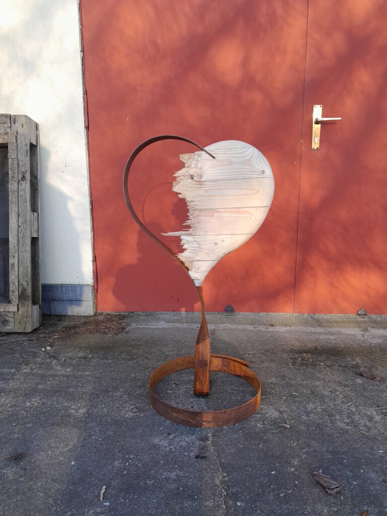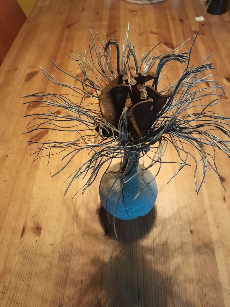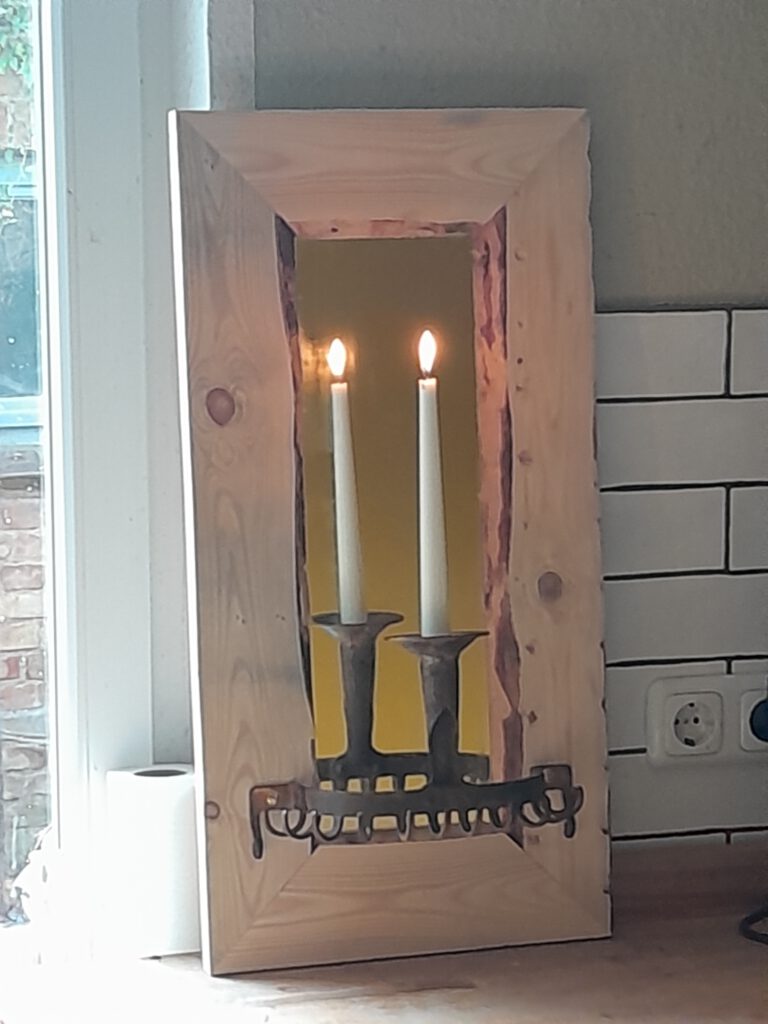 Historische Gartenharke und ein Spiegel im Altholzrahmen.