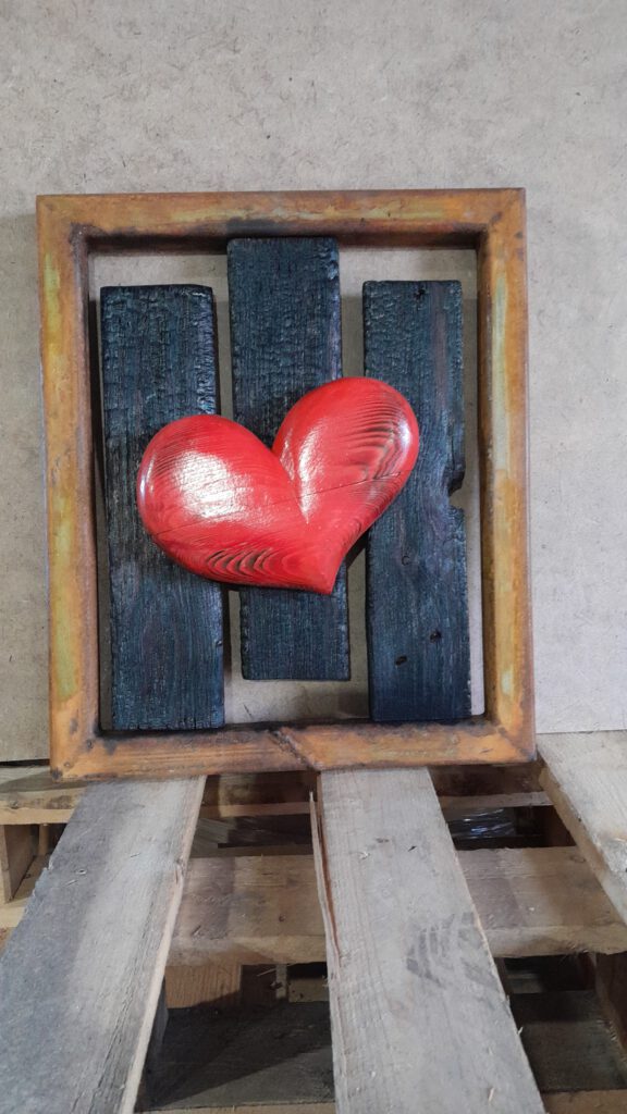 Stilisierter Rinderkopf im Altholz-Rahmen.