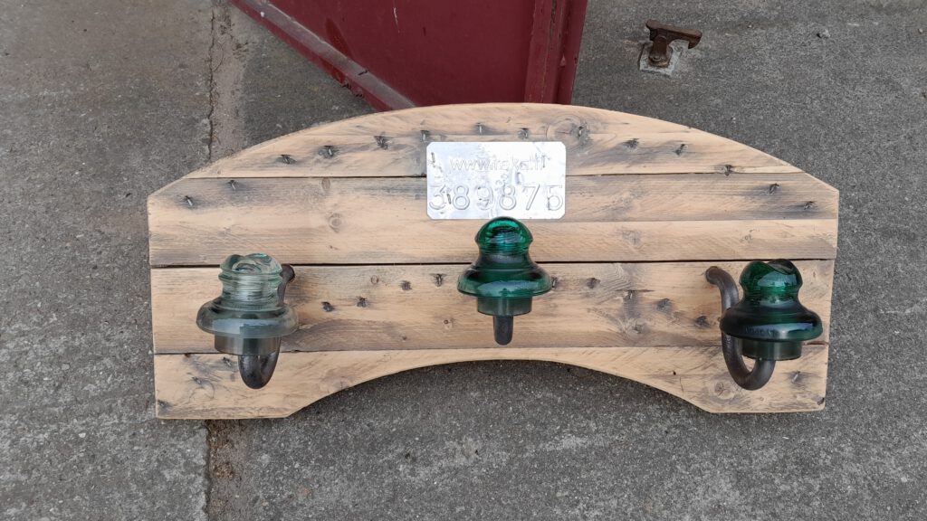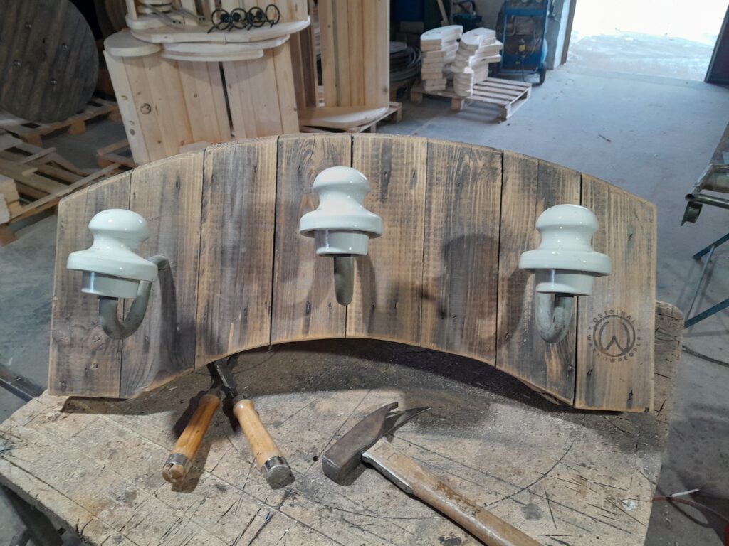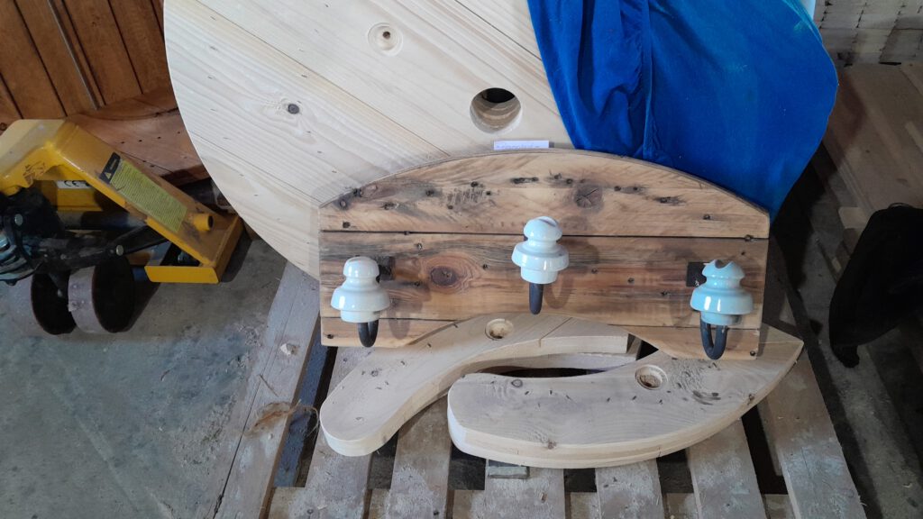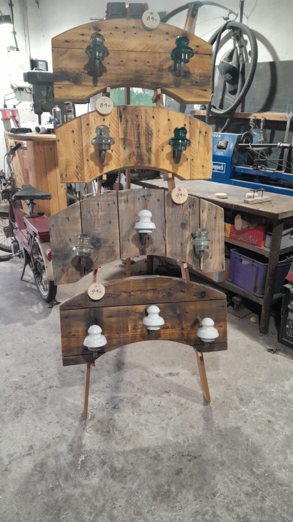 Aus Teilstücken originaler Kabeltrommeln und den historischen Isolatoren entstehen individuelle Unikate. Die farbliche Zusammensetzung der Isolatoren kann nach Verfügbarkeit gewählt werden.